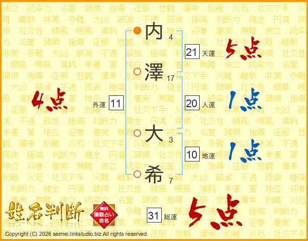 内(4画)澤(17画) 大(3画)希(7画)