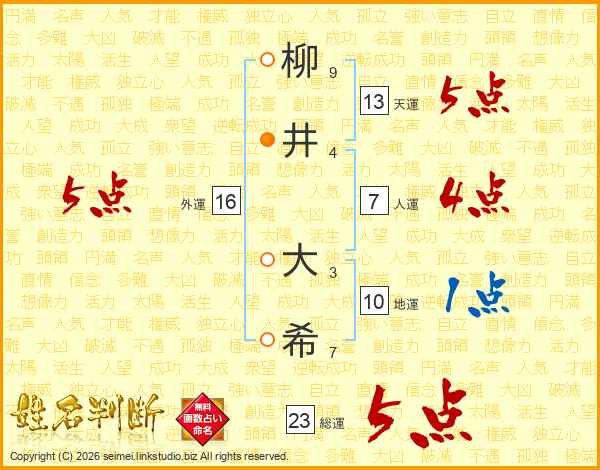 柳井大希さんの総運は23画の5点!