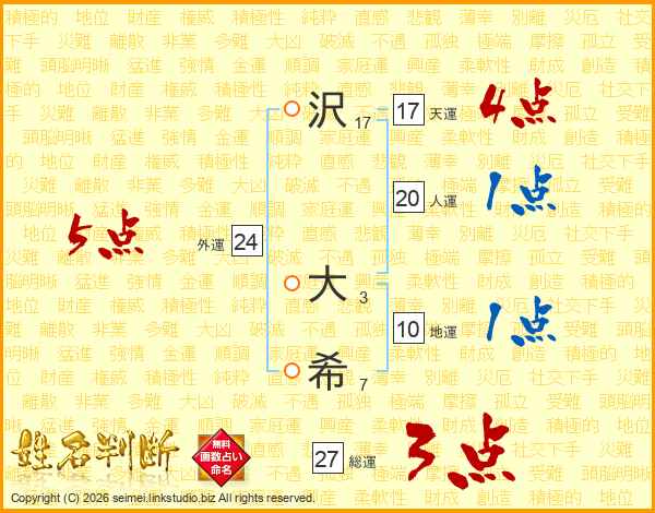 生活面を象徴する運勢です。外部から受ける影響力を表し、結婚運、家庭運や職場、環境への順応性を表します。総運から人運を引いた画数。姓や名が1文字の場合を除く。