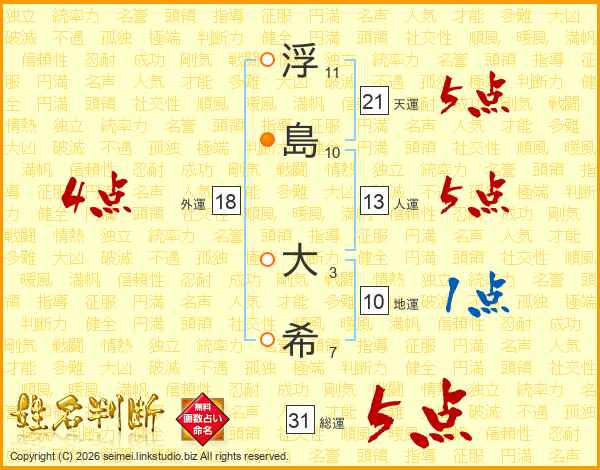 浮(11画)島(10画) 大(3画)希(7画)