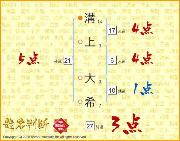 生活面を象徴する運勢です。外部から受ける影響力を表し、結婚運、家庭運や職場、環境への順応性を表します。総運から人運を引いた画数。姓や名が1文字の場合を除く。