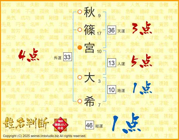 秋(9画)篠(17画)宮(10画) 大(3画)希(7画)