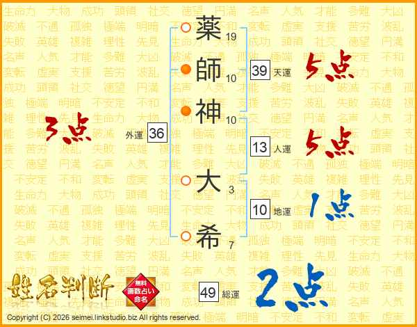 薬(19画)師(10画)神(10画) 大(3画)希(7画)