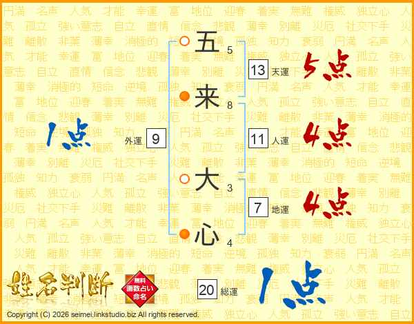 生活面を象徴する運勢です。外部から受ける影響力を表し、結婚運、家庭運や職場、環境への順応性を表します。総運から人運を引いた画数。姓や名が1文字の場合を除く。