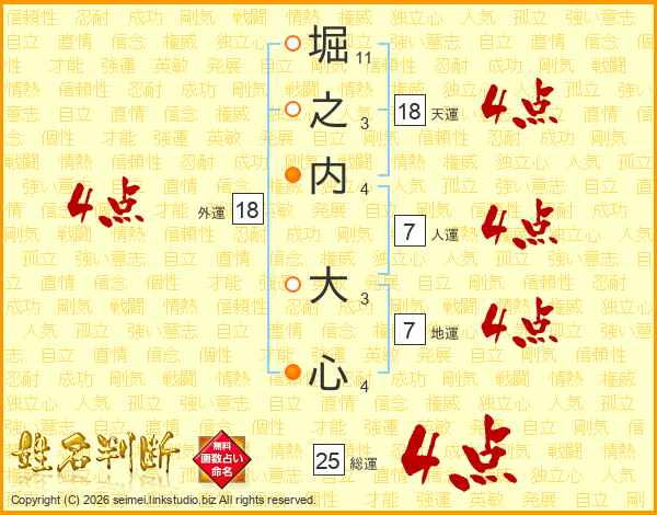 堀(11画)之(3画)内(4画) 大(3画)心(4画)