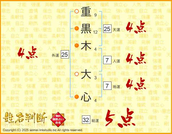 重(9画)黒(12画)木(4画) 大(3画)心(4画)