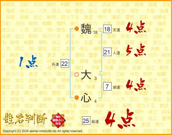 生活面を象徴する運勢です。外部から受ける影響力を表し、結婚運、家庭運や職場、環境への順応性を表します。総運から人運を引いた画数。姓や名が1文字の場合を除く。