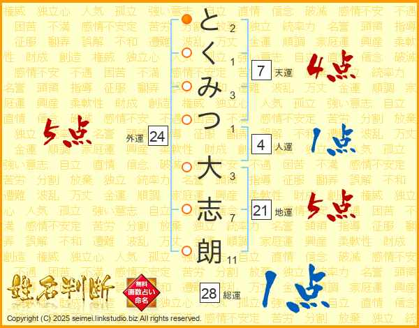 と(2画)く(1画)み(3画)つ(1画) 大(3画)志(7画)朗(11画)