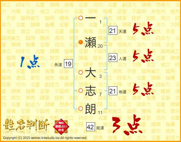 一(1画)瀬(20画) 大(3画)志(7画)朗(11画)