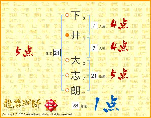 下(3画)井(4画) 大(3画)志(7画)朗(11画)
