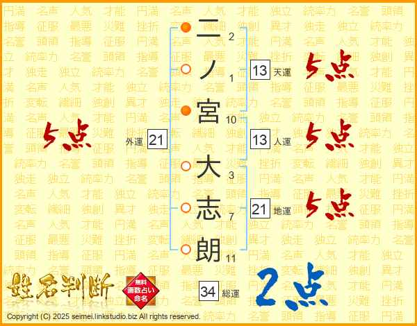 二(2画)ノ(1画)宮(10画) 大(3画)志(7画)朗(11画)