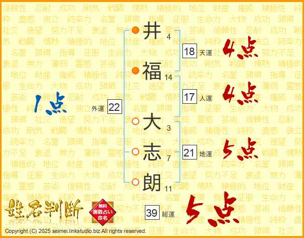 井(4画)福(14画) 大(3画)志(7画)朗(11画)
