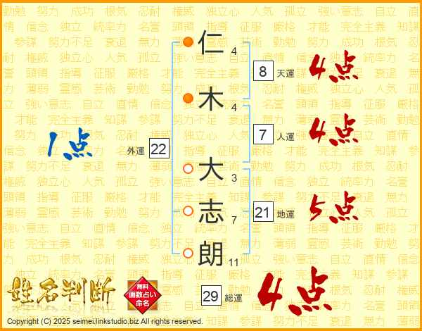 仁(4画)木(4画) 大(3画)志(7画)朗(11画)