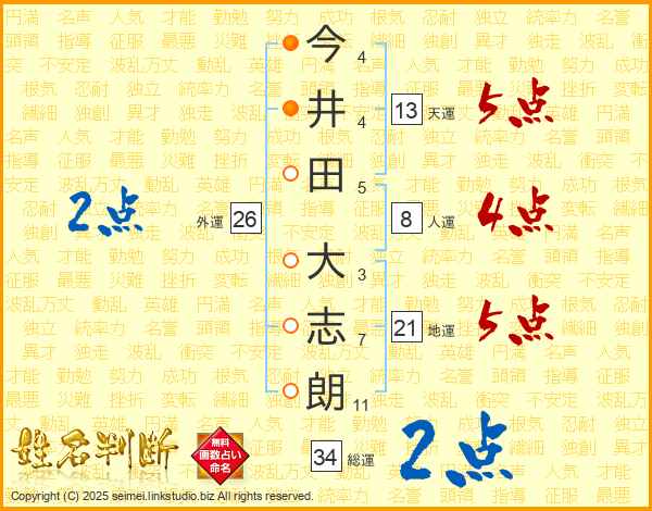 今(4画)井(4画)田(5画) 大(3画)志(7画)朗(11画)