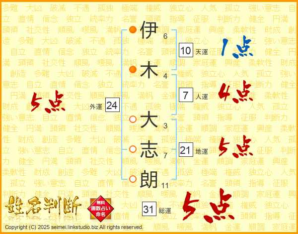 伊(6画)木(4画) 大(3画)志(7画)朗(11画)