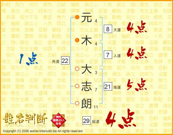 元(4画)木(4画) 大(3画)志(7画)朗(11画)