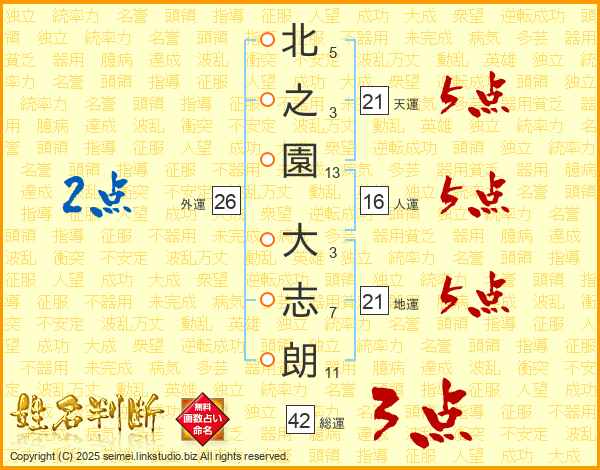 北(5画)之(3画)園(13画) 大(3画)志(7画)朗(11画)