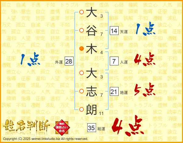 大(3画)谷(7画)木(4画) 大(3画)志(7画)朗(11画)
