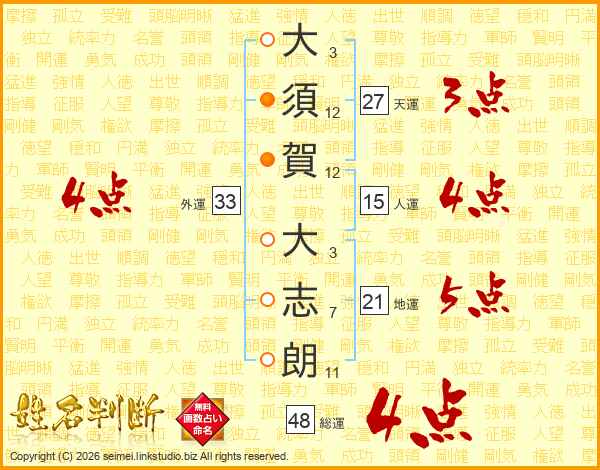 大(3画)須(12画)賀(12画) 大(3画)志(7画)朗(11画)