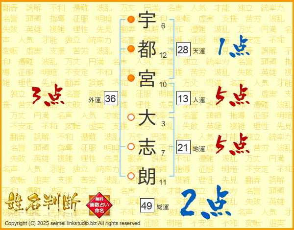 宇(6画)都(12画)宮(10画) 大(3画)志(7画)朗(11画)