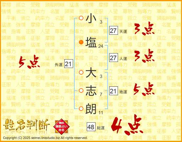 小(3画)塩(24画) 大(3画)志(7画)朗(11画)