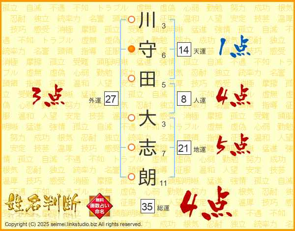 川(3画)守(6画)田(5画) 大(3画)志(7画)朗(11画)