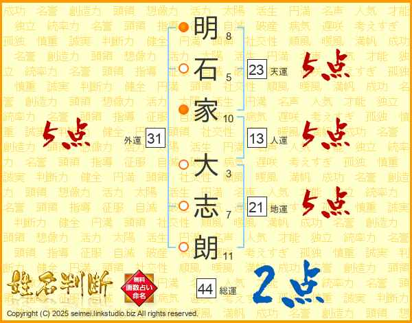 明(8画)石(5画)家(10画) 大(3画)志(7画)朗(11画)
