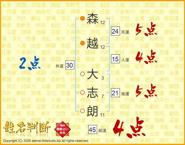 森(12画)越(12画) 大(3画)志(7画)朗(11画)