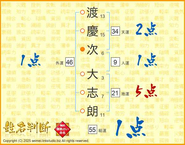 渡(13画)慶(15画)次(6画) 大(3画)志(7画)朗(11画)