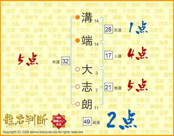 溝(14画)端(14画) 大(3画)志(7画)朗(11画)