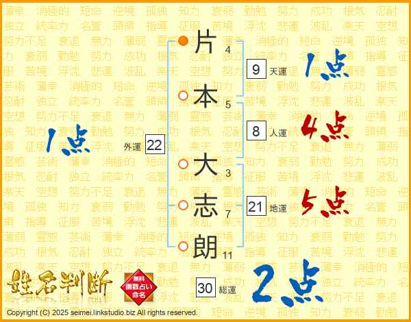 片(4画)本(5画) 大(3画)志(7画)朗(11画)