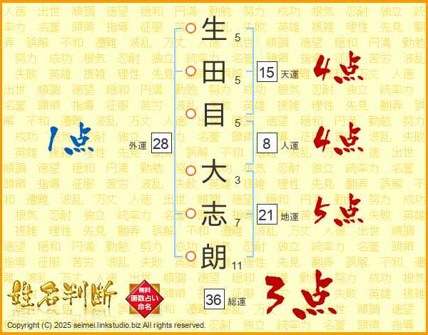 生(5画)田(5画)目(5画) 大(3画)志(7画)朗(11画)