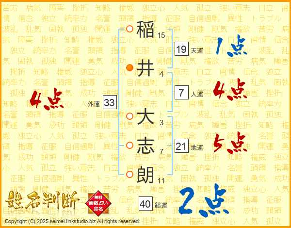 稲(15画)井(4画) 大(3画)志(7画)朗(11画)