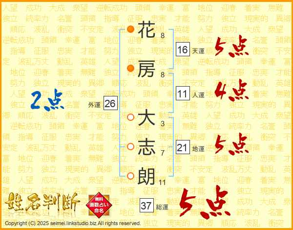 花(8画)房(8画) 大(3画)志(7画)朗(11画)