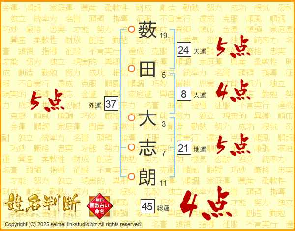 薮(19画)田(5画) 大(3画)志(7画)朗(11画)