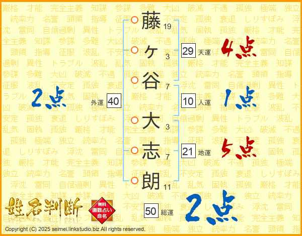 藤(19画)ヶ(3画)谷(7画) 大(3画)志(7画)朗(11画)