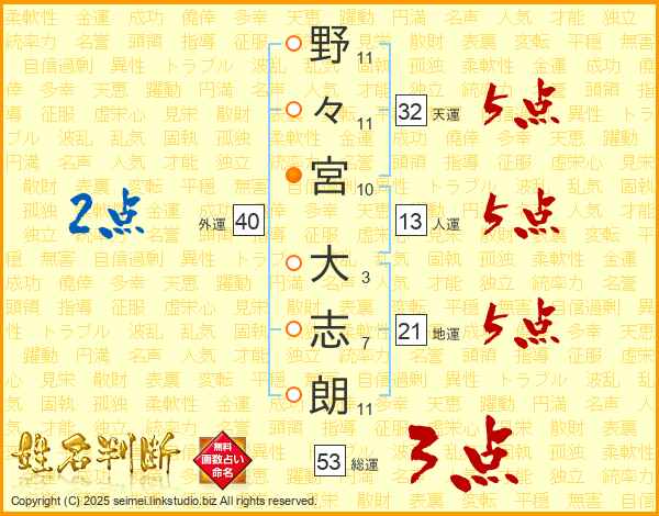 野々宮大志朗さんの人運は13画の5点!