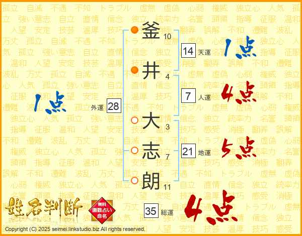 釜(10画)井(4画) 大(3画)志(7画)朗(11画)