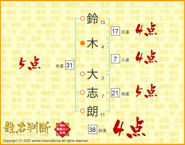 鈴(13画)木(4画) 大(3画)志(7画)朗(11画)