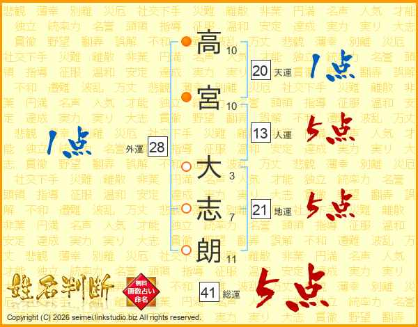 高(10画)宮(10画) 大(3画)志(7画)朗(11画)