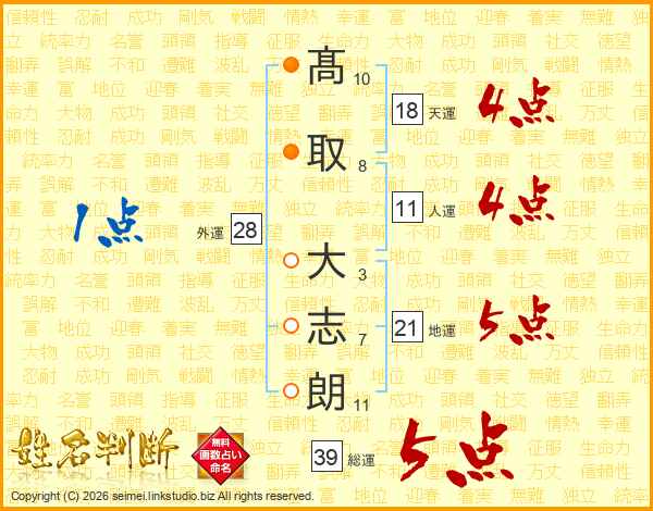 髙(10画)取(8画) 大(3画)志(7画)朗(11画)