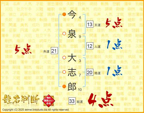 今(4画)泉(9画) 大(3画)志(7画)郎(10画)