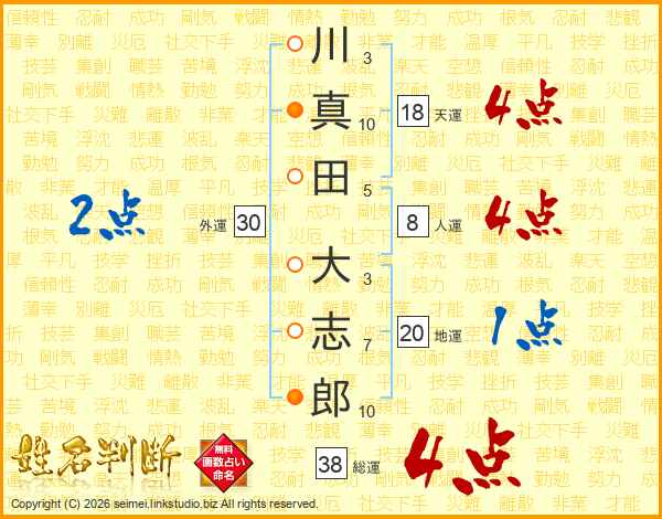 川(3画)真(10画)田(5画) 大(3画)志(7画)郎(10画)