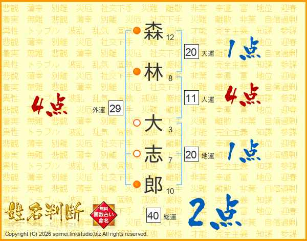 森(12画)林(8画) 大(3画)志(7画)郎(10画)