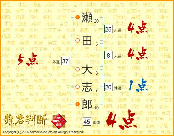 瀬田大志郎さんの総運は45画の4点!