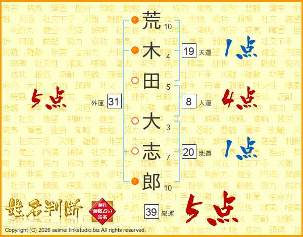 荒(10画)木(4画)田(5画) 大(3画)志(7画)郎(10画)