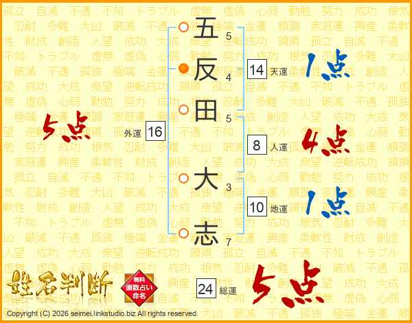 五(5画)反(4画)田(5画) 大(3画)志(7画)