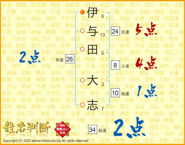 伊(6画)与(13画)田(5画) 大(3画)志(7画)