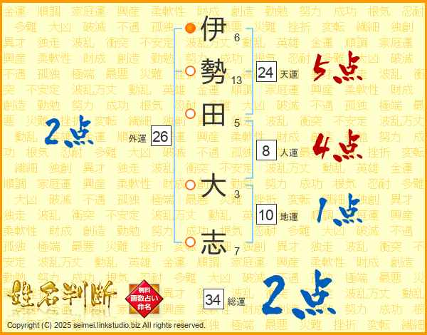 伊(6画)勢(13画)田(5画) 大(3画)志(7画)