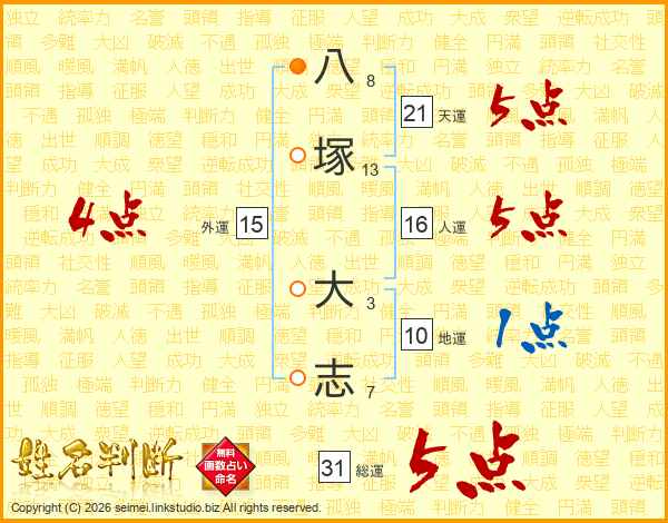 あなたの人生を表す1番重要な運勢です。生涯を通じて影響する総合運となり、主に50歳以降の晩年期に影響を及ぼします。苗字と名前の合計画数。